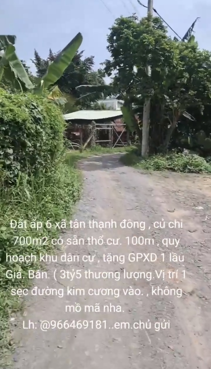 BÁN LÔ ĐẤT Ấp 6 Xã Tân Thạnh Đông Củ Chi Diện tích; 700m2. Có 100m thổ cư. Quy Hoạch Khu Dân Cư Đường ôtô tới đất Thích hợp làm nhà vườn. ⚡️Giá bán ( 3tỷ5 gặp chủ thương lượng bớt lộc ) Lh : 0333997769 & 0902896915